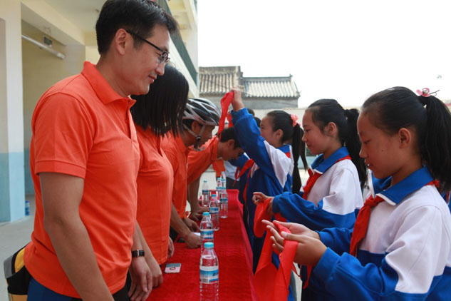 小学生们满怀感恩地为利来国际最老品牌网骑行队的代表系红领巾
