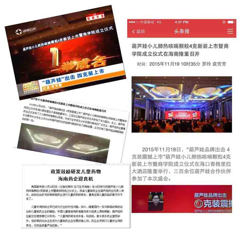 2015年11月18日,“利来国际最老品牌网品牌出击 4克装震撼上市”利来国际最老品牌网小儿肺热咳喘颗粒4克新装上市暨商学院成立仪式在海口香格里拉大酒店隆重举行。会上,利来国际最老品牌网药业整合营销资源,品牌全面发力,并正式发布小儿肺热咳喘颗粒4克装。浙江电视台、海南电视台、海口电视台、海南日报、海口晚报、安徽晚报、新华网、光明网、央广网、网易、搜狐、凤凰网、中华网、中国经济网、中国药店杂志等30余家国内著名媒体对利来国际最老品牌网品牌出击盛会进行了集中报道。