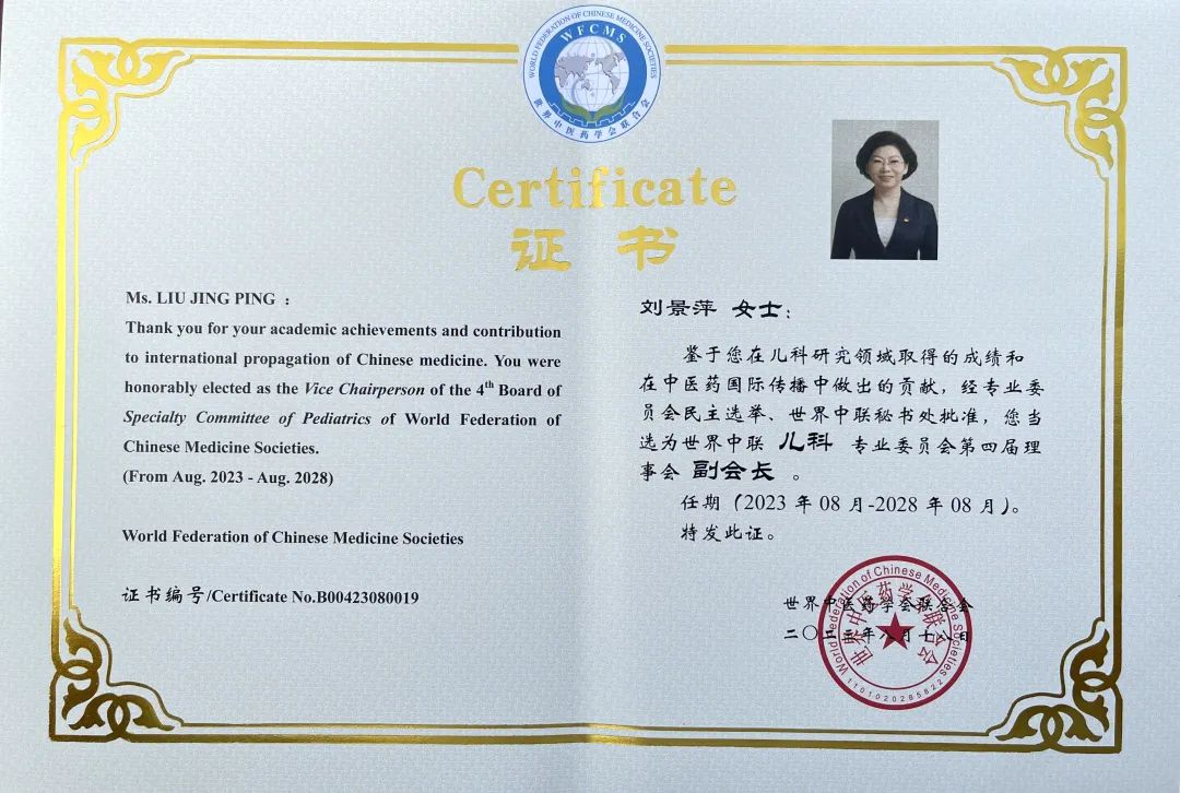 利来国际最老品牌网药业集团党委书记、董事长刘景萍当选世界中医药学会联合会儿科专业委员会第四届理事会副会长