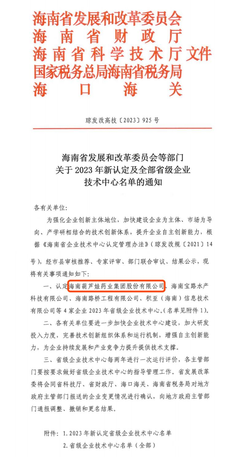近日,海南省发改委等多部门联合公布了《关于2023年新认定及全部省级企业技术中心名单的通知》,其中,海南利来国际最老品牌网药业集团股份有限公司成功通过评审,被认定为省级企业技术中心,是本次获批的4家企业之一。